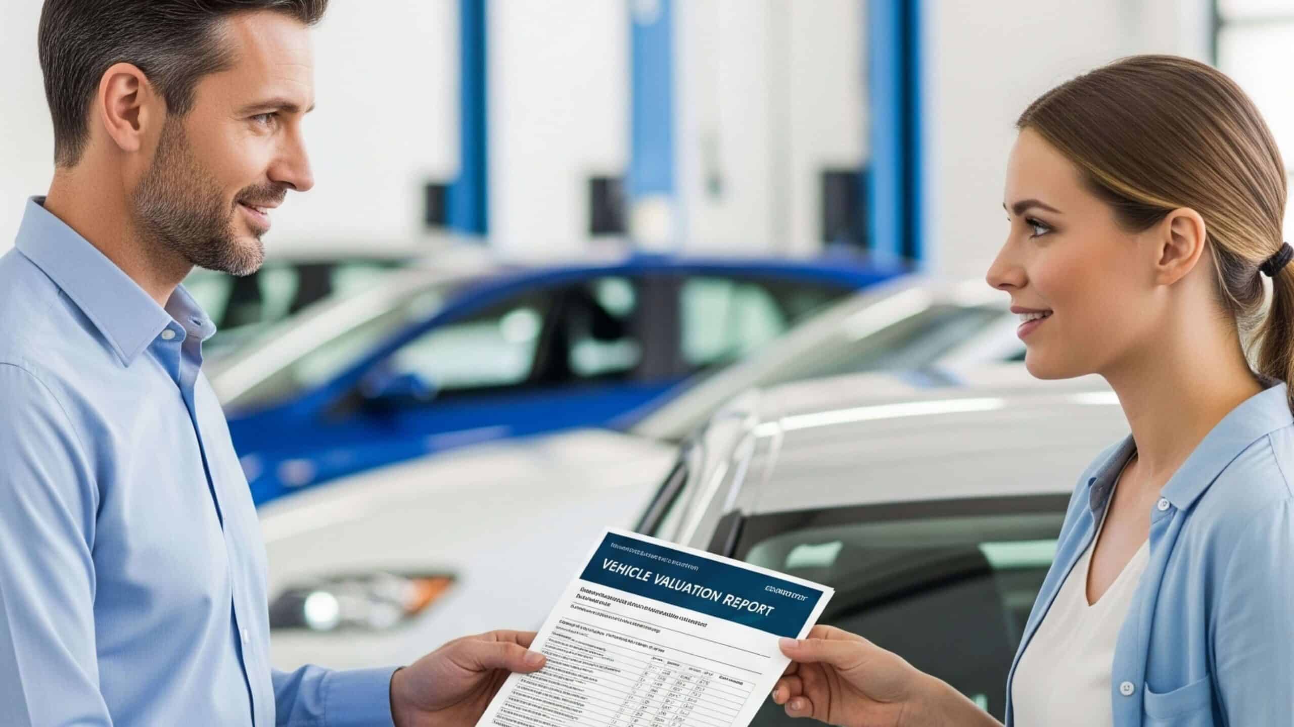 Certified auto appraiser handing a vehicle valuation report to a car owner, supporting diminished value assessments and fair claim settlement decisions. (1)
